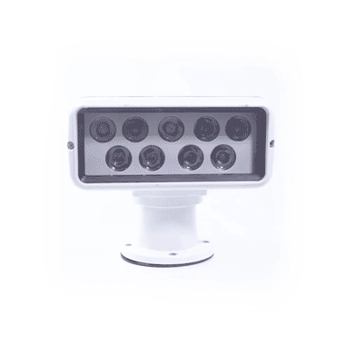 The RCL-100 LED searchlight continues to utilize the same rugged design as the original RCL-100D, but incorporates a new efficient 9 LED array that produces over 220,000 candelas of light. The strong and light aluminum housing along with glass lens are weather-sealed for years of trouble-free operation. Other features include a wired remote that allows continuous 360 degrees of rotation at fast or slow speed without the hassle of a hard stop. With a 7-degree beam angle, the light also provides elevation angles at 9 degrees up and 17 degrees down to make lighting draw bridges, buoys, and docks a breeze.