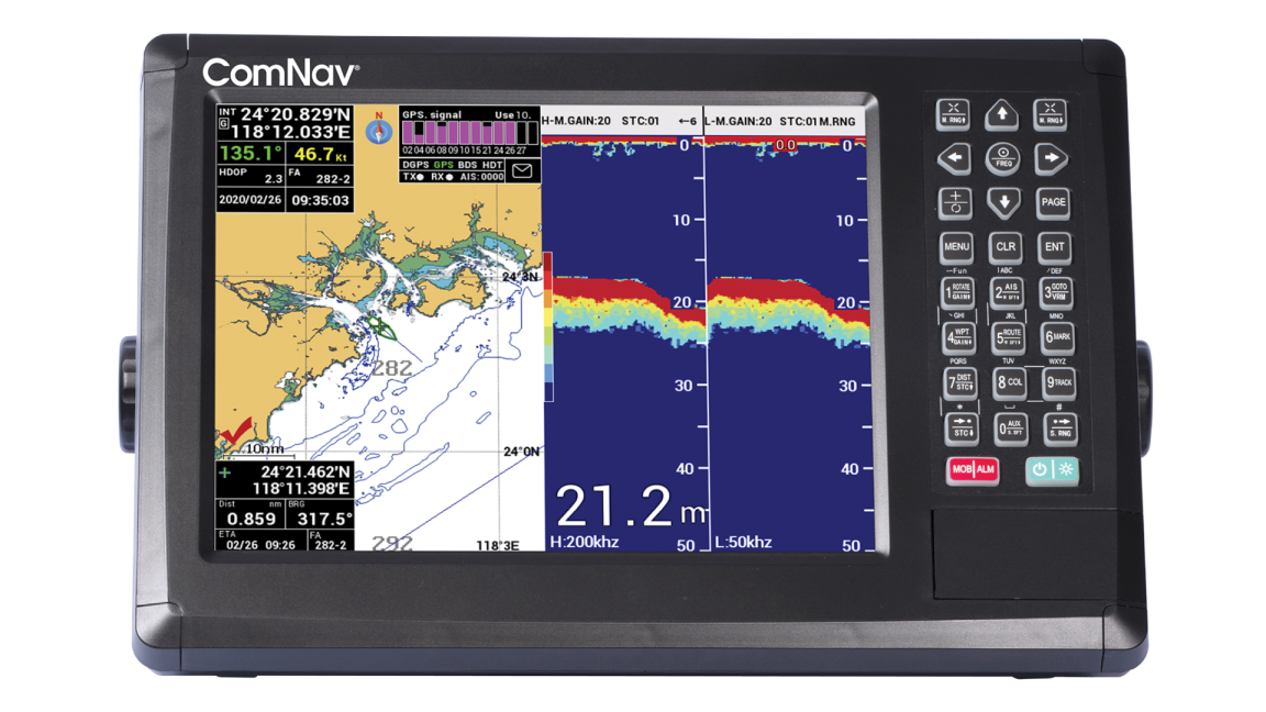 ComNav’s M10 Touchscreen Series Chart-Plotter, Fish-Finder and Multi-Function Display incorporate GNSS, supporting multi chart applications, echo sounder, AIS target dynamic display, 3D navigation and complementary fish finder views. The M10 incorporate intelligent automatic operation mode in echo sounder mode, with advanced features as automatic seabed tracking, auto range, auto shift and auto gain controls. All pertinent digital repeater dials are provided for easy to read visualization.